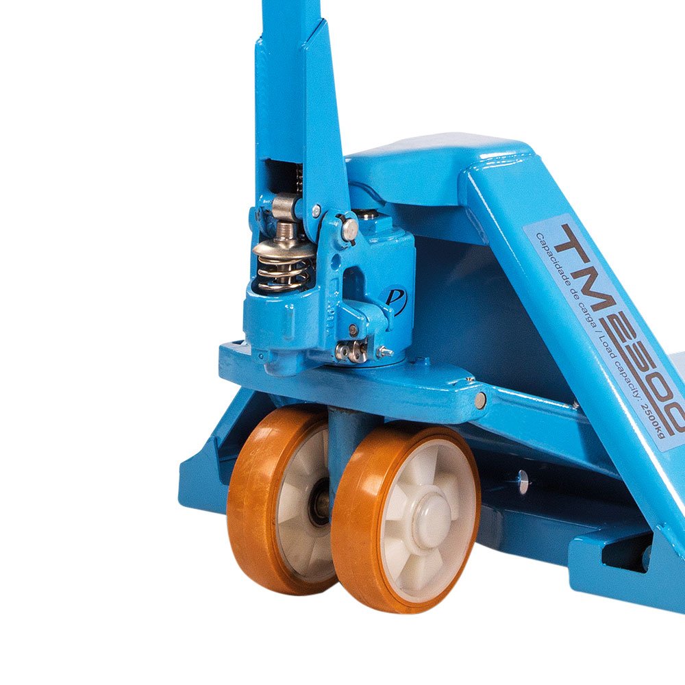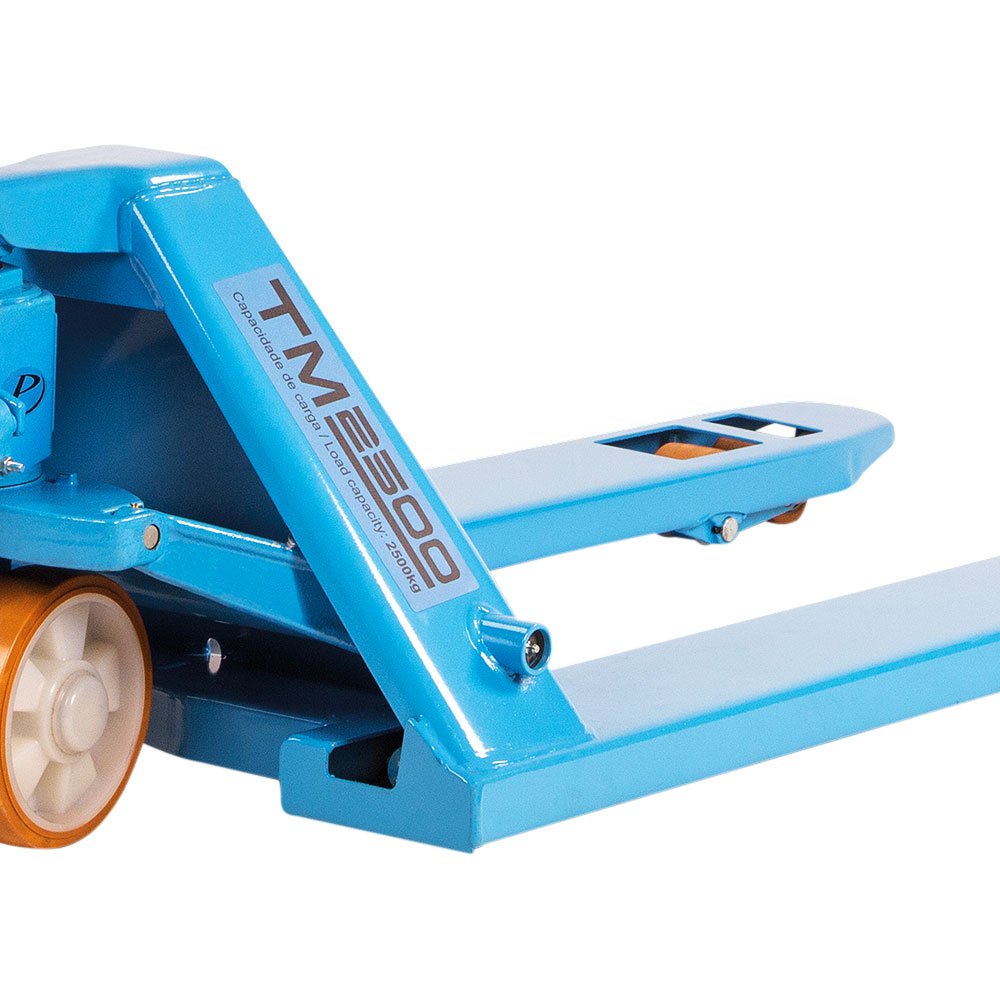 O modelo TM2500 RTP 525 tem capacidade de carga de 2.500 kg, com rodas tandem (trucado) nas extremidades do garfo em poliuretano.