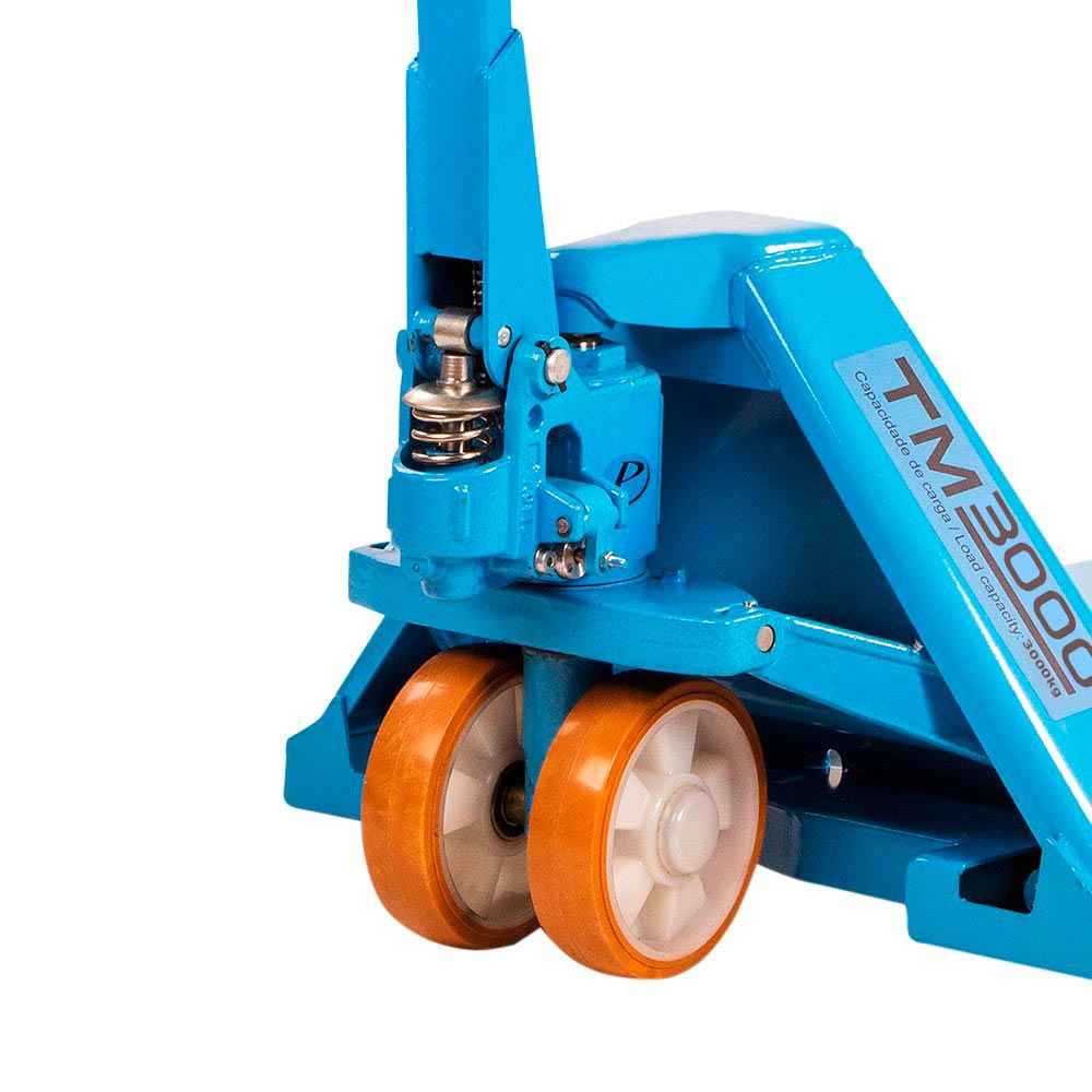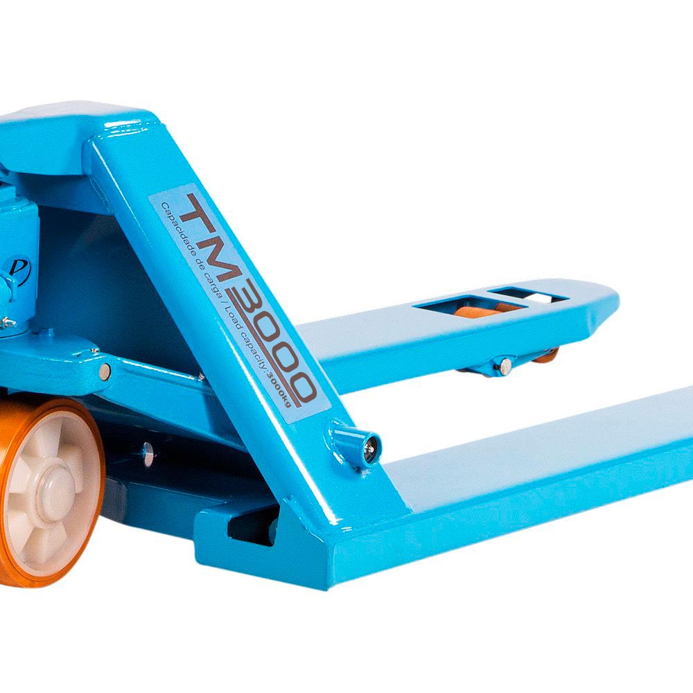 O modelo TM3000 RTP 680 tem capacidade de carga de 3.000 kg, com rodas tandem (trucado) nas extremidades do garfo em poliuretano.